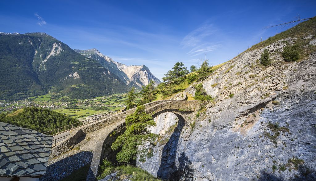 Seit dem 16. Jh. überquert die Hohe Brücke die schroffe Feschelschlucht und verbindet die Ortschaften der Leuker Sonnenberge untereinander und mit dem ehemaligen Zehndenhauptort Leuk. Dass bei diesem waghalsigen Brückenschlag nicht nur Menschenhand im Spiel gewesen sein soll, darüber scheiden sich die Geister. Auf den vereinbarten Zoll wartet der Gehörnte jedoch heute noch.