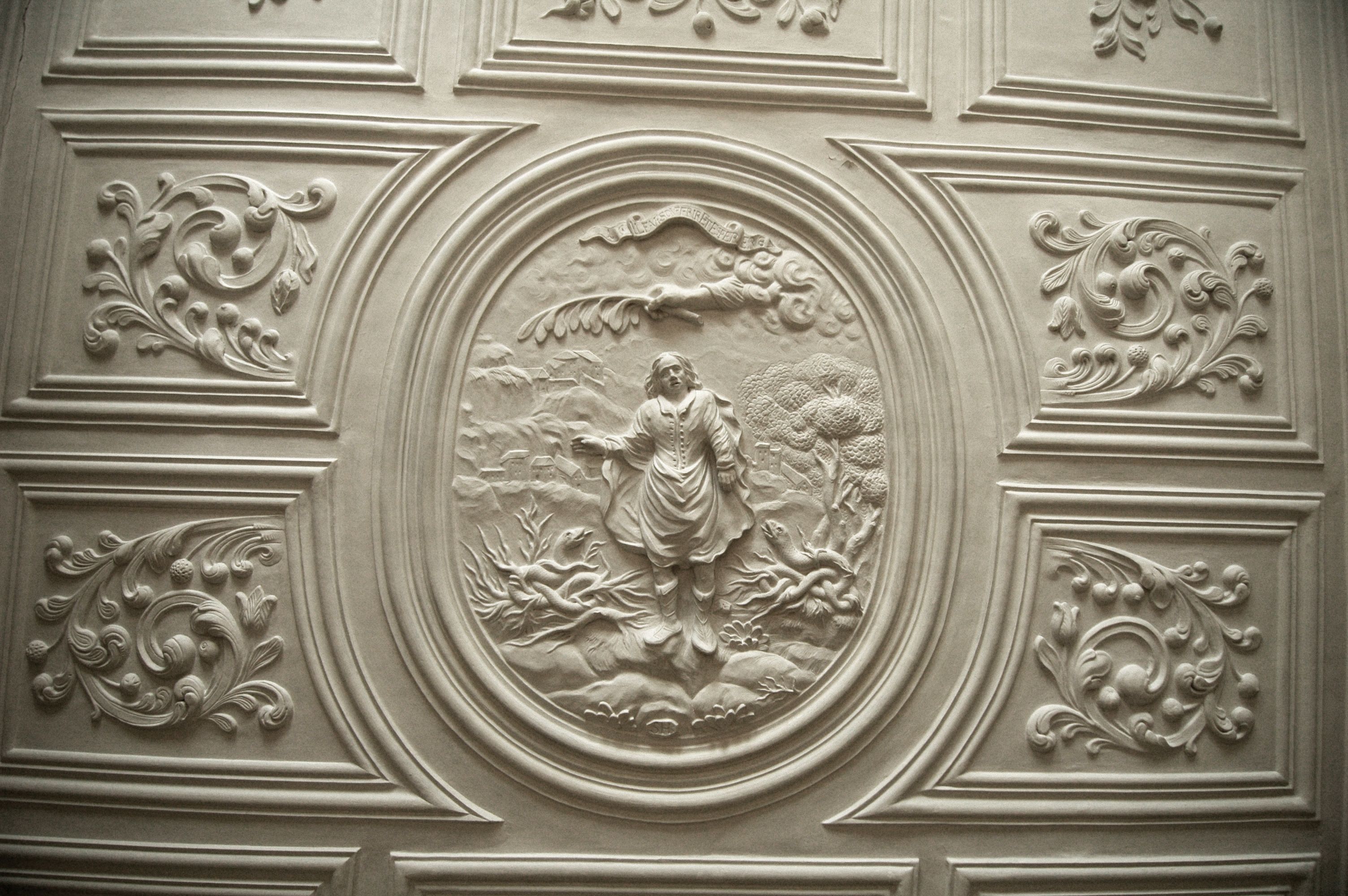 Schaffhausen brachte zwischen 1660 und 1760 die einzige namhafte Stuckateurschule der Deutschschweiz hervor. Im Grossen Haus am Fronwagplatz begegnen wir den Werken gleich mehrerer Meister. Von Samuel Höscheller stammt das auch als historisches Zeugnis interessante Hugenotten-Relief von 1687. Hans Jakob Schärer signierte 1721 seine florale Decke mit Jakobs Kampf mit dem Engel. Zwei zierliche Rokoko-Decken nicht namentlicher Meister zeigen, wohin die Entwicklung seit Samuel Höscheller führt.